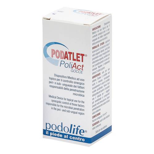 Componente rilevante e frequente della Tinea Pedis (Piede d’Atleta). L’onicomicosi è un’affezione dell’unghia molto comune che colpisce all’incirca il 20% della popolazione; nei pazienti di età superiore ai 60 anni l’onicomicosi raggiunge percentuali molto più elevate, tra il 50 e il 75%. Sono stati individuati numerosi fattori di rischio che predispongono all’onicomicosi; molti di questi fattori sono caratteristici di soggetti anziani (neuropatie periferiche, ischemia, stasi venosa, tromboflebite cronica, diabete, ipertensione, ecc.). Anche nel soggetto giovane e adulto, l’uso crescente di calzature ad insufficiente traspirazione, la frequentazione di arenili infetti, di piscine, di docce, ecc. costituiscono fattori di rischio crescente per le infezioni micotiche dell’unghia. La penetrazione del micete dipende dal grado di reattività dei tessuti dermo-epidermici che compongono l’apparato ungueale (letto ungueale, matrice ungueale, iponichio, ecc.). Tali manifestazioni si accompagnano frequentemente a condizioni di trofismo dell’unghia con alterazione di forma, colore, struttura (onicodistrofia). Le sostanze contenute in PODATLET PoliAct GOCCE, agiscono in maniera sinergica e sincronica sia sul controllo del grado di reattività dei tessuti cutanei e mucocutanei (attraverso precisi meccanismi biologici) equilibrando le naturali difese messe in atto dall’organismo per contrastare la penetrazione e la proliferazione dei miceti; sia sulla normalizzazione del trofismo ungueale. L’Adelmidrol regola l’attività del mastocita dermico; il complesso Acido Undecilenico - Fitosfingosina - Acido Usnico - Triclosan-Bronopol agisce da bio-inibitore della crescita microbica concorrendo, così, a limitare il rischio di onicomicosi; la Biotina e la Vitamina A regolano la differenziazione cheratinocitica; la Polidatina determina effetto antiradicali liberi e l’Urea contrasta l’ispessimento della lamina ungueale.