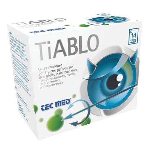 Garza monouso di cotone imbevuta di una sospensione con caratteristiche umettanti in grado di svolgere un'attività detergente. Tiablo è un dispositivo medico per adulti e bambini indicato in caso di infiammazioni, infezioni, allergie, secrezioni oculari, manifestazioni infettive o allergiche.